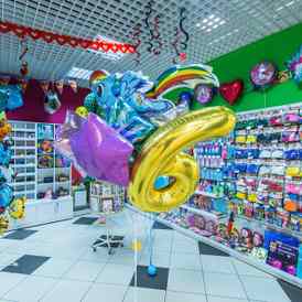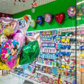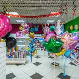 Товары. Специализация магазинов — все для праздника: наборы для декора помещения, свечи для торта, колпаки, хлопушки, гирлянды, горны, воздушные шары с гелием, одноразовая посуда, карнавальные маски, мыльные пузыри, поздравительные открытки и пакеты.